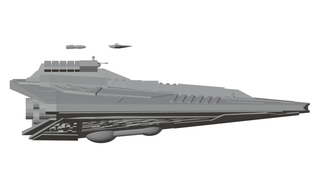My final renders of it scale it with three ships, two of my “Dreadnaught Heavy Cruiser” designs, which measure in at roughly 600m in length, and my “Acclamator” transport ship, which is closer to 800m. Both of these ships are still absolutely dwarfed by the 9km Mandators though.
